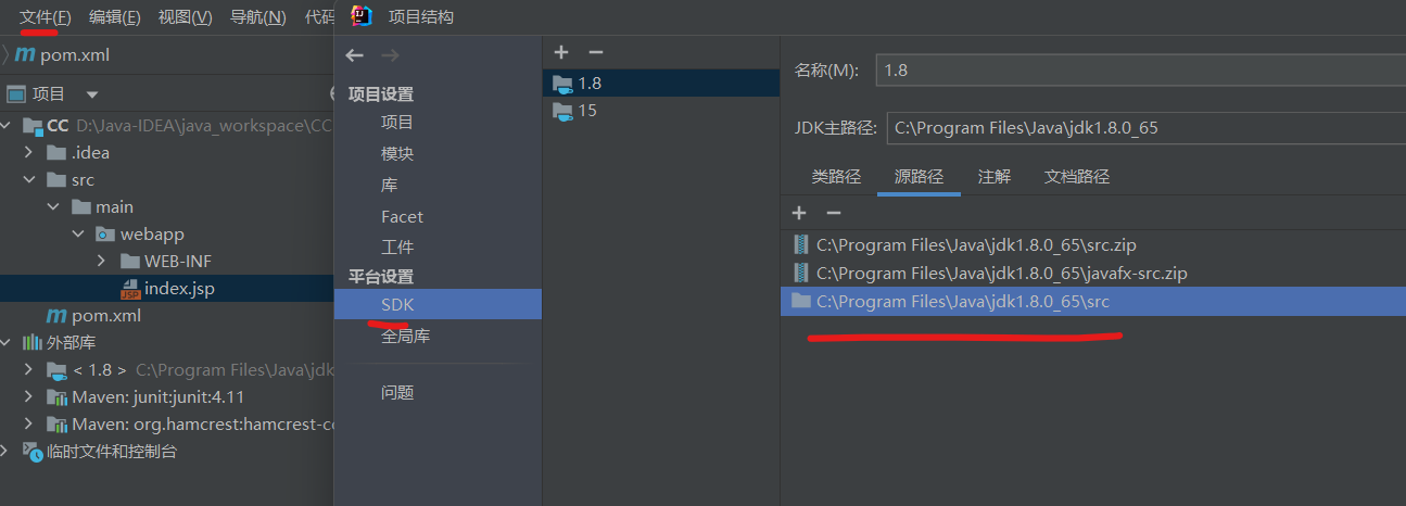 然后打开 IDEA 文件->项目结构-> SDK -> 源路径设置 填上刚才设置的的src目录