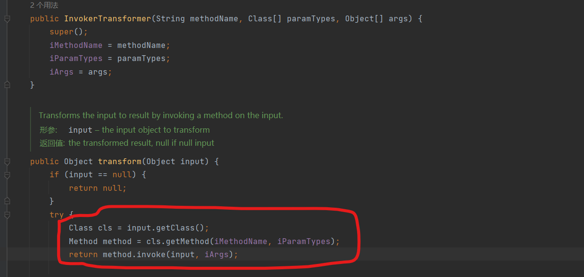 转化为用链子的Sink点 InvokerTransformer的transform来反射 代码如下: