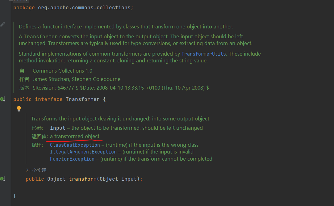 (1) 找Sink 链子主要用到的是这个 transformer接口。这个接口就接受一个Object类然后利用方法transform