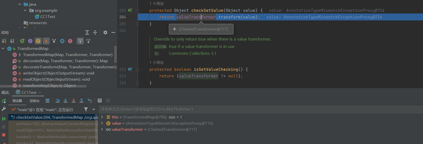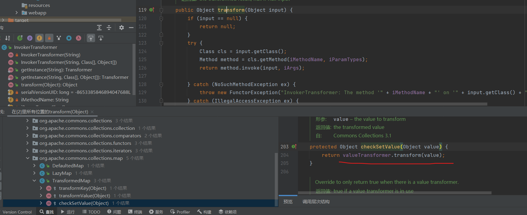 发现TransformedMap类的 checkSetValue() 里使用了 valueTransformer调用transform()