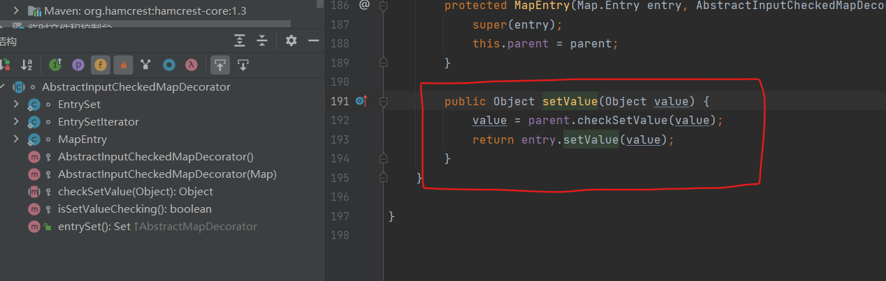 跟进查看 发现只有 父类 AbstractInputCheckedMapDecorator抽象类里的 MapEntry 的setValue() 调用了checkSetValue()