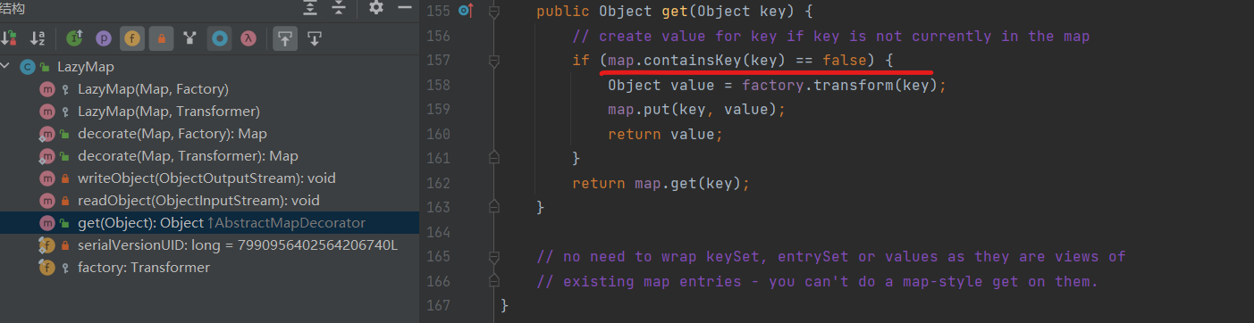 它会判断key是否存在,不存在的话,才会去执行 factory.transform() 因此我们需要在生成序列化对象的时候,将LazyMap对象里的那个map的key置空。