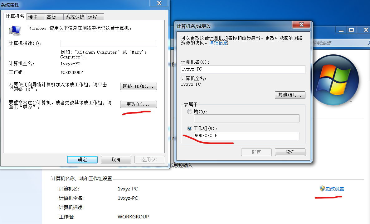 右键桌面上的”计算机”,弹出的菜单里选择”属性”,点击”更改设置”,”更改” 在”计算机名”一栏输入你想好的名称,在”工作组”一栏输入你想要加入的工作组名称
