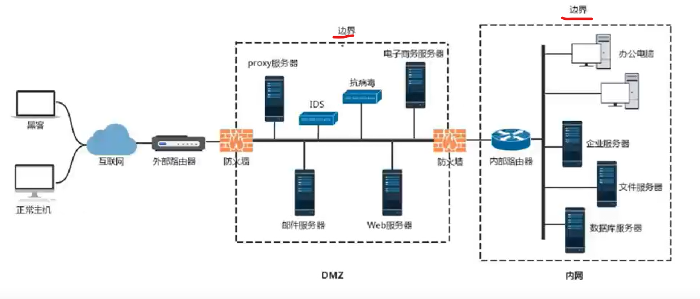 这里就是两个边界,两个域。如果那个电子商务服务器,想访问里面那个域的服务器,需要有一个合法的身份登入那个域中。