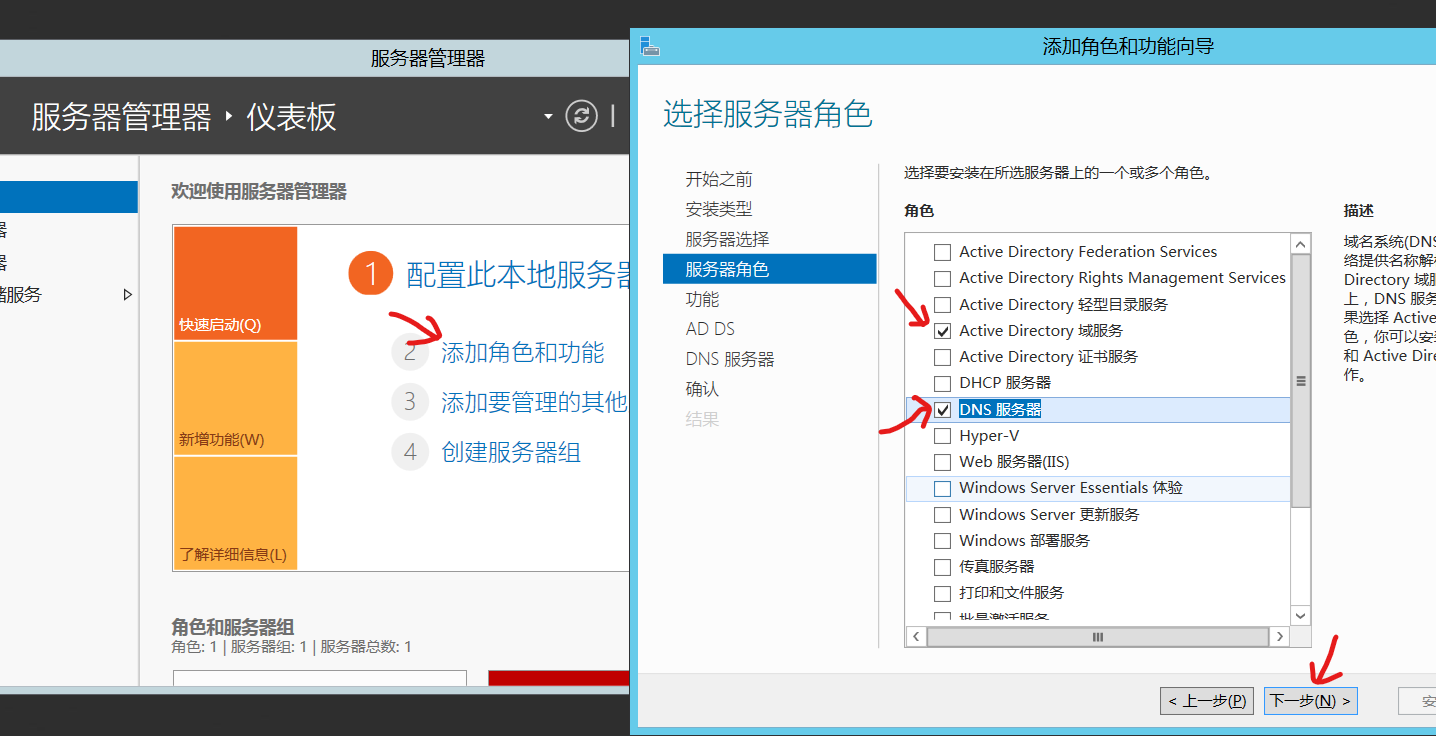 在服务器管理器中,选择 添加角色和功能 -> 默认下一步至服务器角色,点上 Active Directory域服务 与 DNS服务器