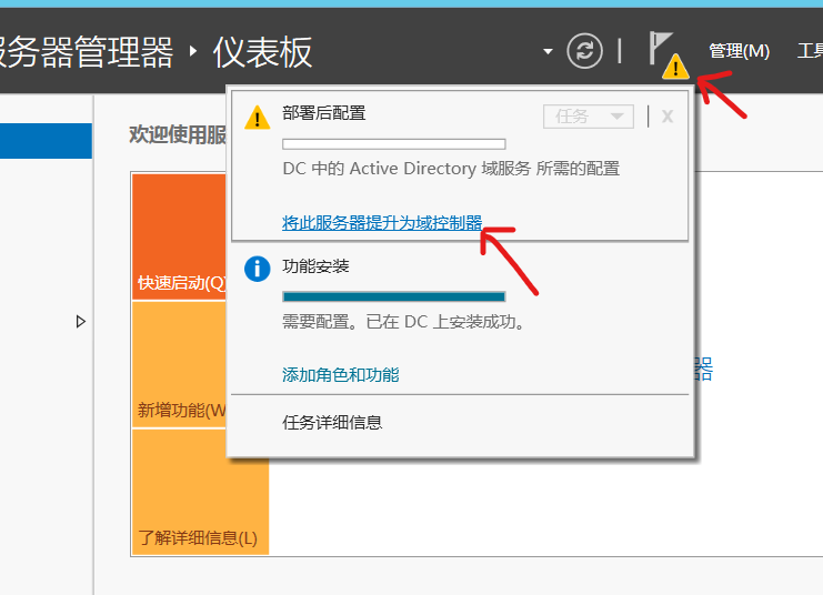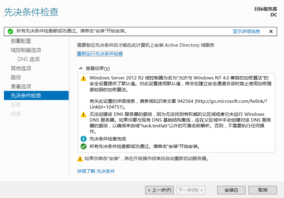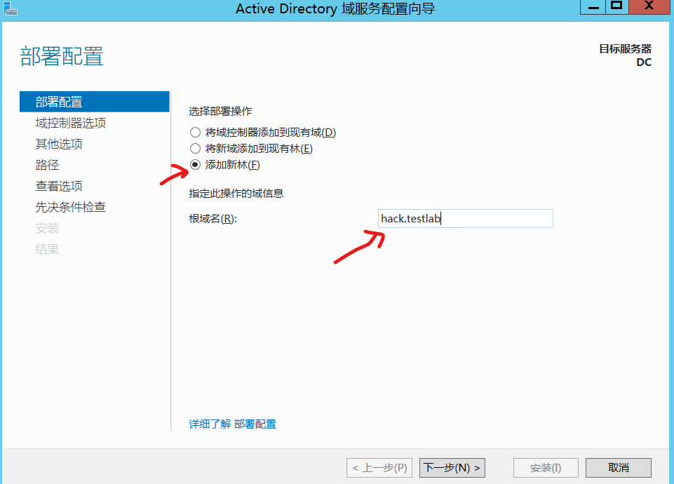 点击🚩旁边的⚠,点击 将此服务器升为域控制器 并且 添加新林,设置根域名为 hack.testlab