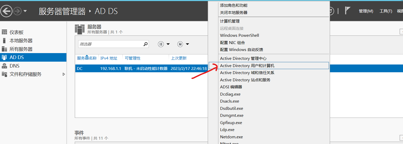 在那个服务器管理界面也就可以看见 AD、IDS、DNS等服务了