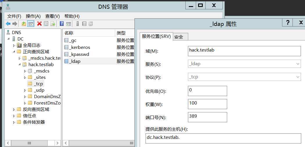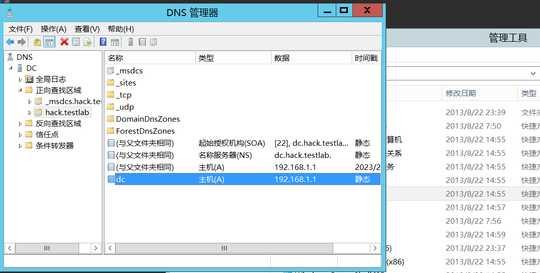 可以看到dc主机的记录,可以看到我们的域控 hack.testlab已经正确的将主机和ip地址注册到DNS服务器,域里的其他机器就可以通过这个找到域控。