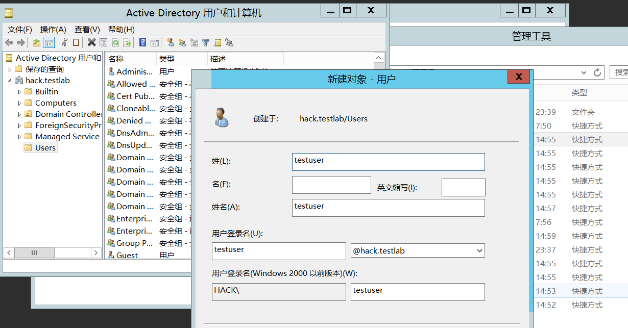 选择Users目录,右键,新建对象–用户,创建一个testuser账户