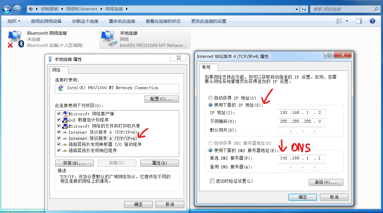 同Windows7,设置ip为192.168.1.3 和DNS服务器 192.168.1.1