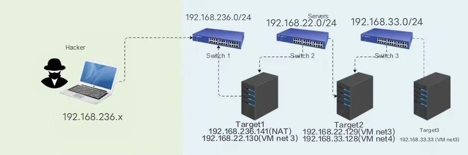 三个主机的网络环境拓扑图,攻击机的网段在192.168.236.0/24,三台靶机的IP地址分别如图: